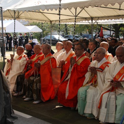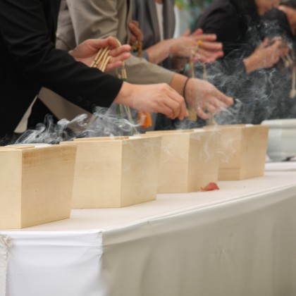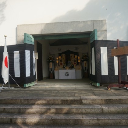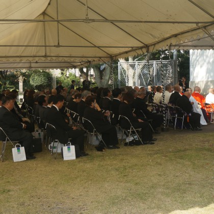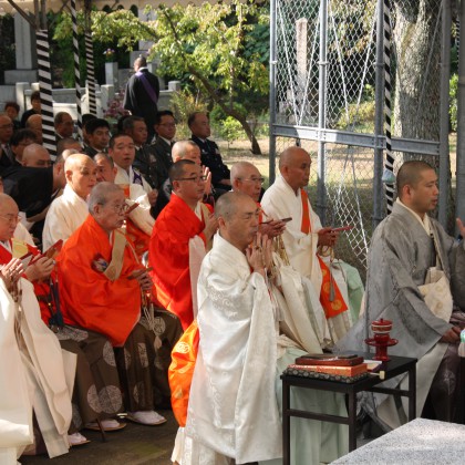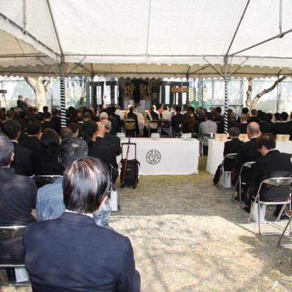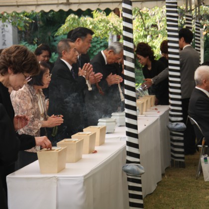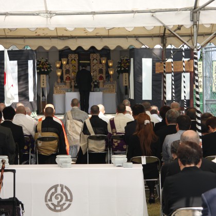 慰霊式典としては、墓地内にある納骨堂前にて行われ、本門佛立宗清風寺歴代住職以下多数の僧侶のご奉仕による読経と当法人理事長の祭文奏上、遺族会代表の追悼の言葉、そして参詣者一人一人が焼香を行って、懇ろに法要を営んでおります。